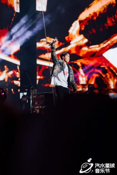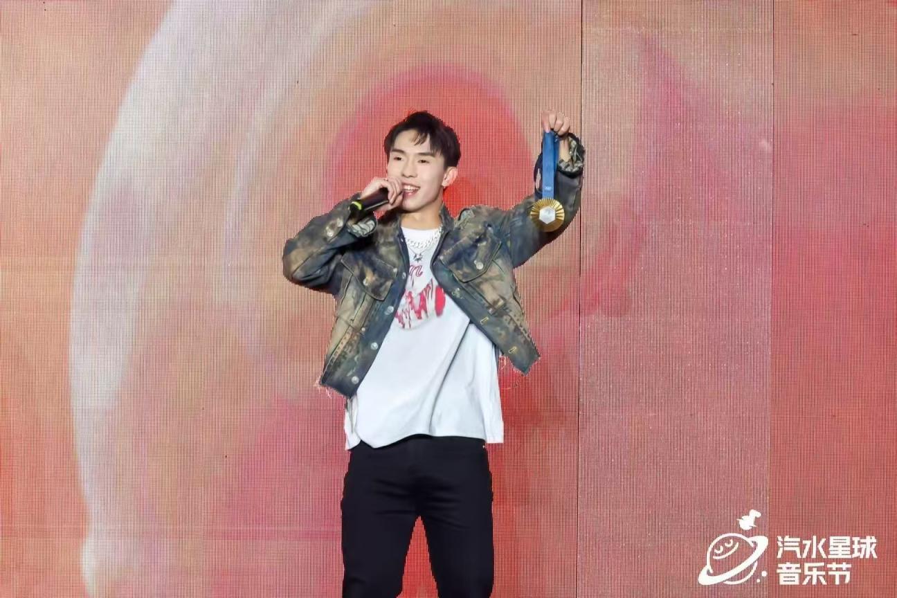 在青岛音乐节上,龙道一手持金牌登台演唱。受访者供图
