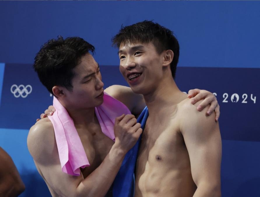 龙道一(右)与王宗源搭档获得巴黎奥运会跳水男子双人3米板冠军,这是他们在比赛中。图片